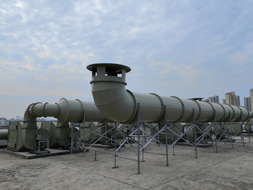 4、室外噪聲應控製在70dB(A),實驗室內噪聲應控製在55dB(A),(室內噪聲GB60分貝(bèi)超(chāo)標,室外噪(zào)音(yīn)大約為75分(fèn)貝)。風機(jī)的噪聲可以分為本身的(de)機械噪聲(此噪(zào)聲主要由風扇質量(liàng)不同引(yǐn)起)和風(fēng)聲(為(wéi)主要噪聲)。在風機功率不大的情況下,可通過在風機上方加防雨罩來消除風聲,在使用大功率風機時(shí)一般在風機進出口加消聲器來消除風聲,機械噪聲(shēng)主要(yào)靠建隔音牆、小黑屋或在風機進出口加軟接頭來解決,減振的主要方法為風機底座做成減振底座(zuò)並安裝減振器或加裝減振墊。